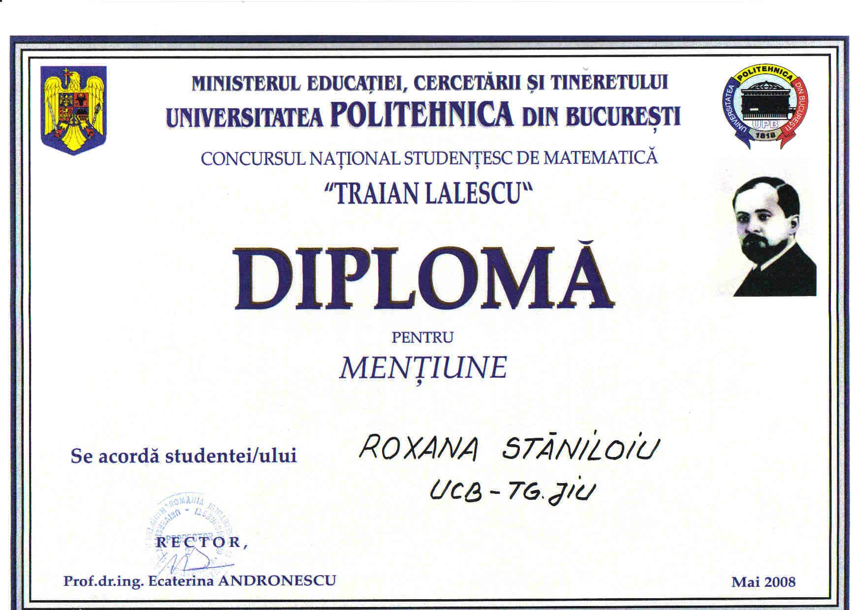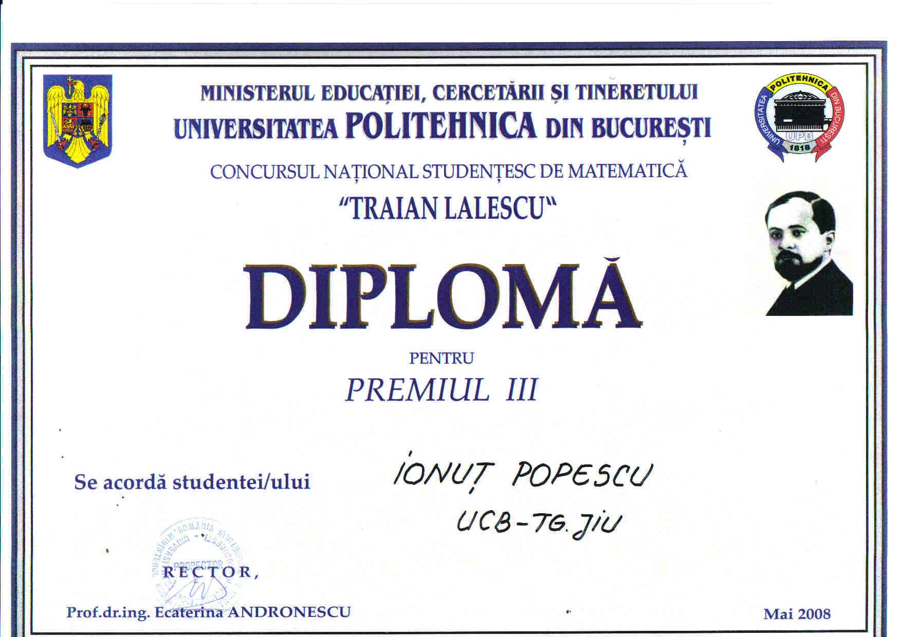 The student national competition Traian Lalescu was held at University Politehnica Bucharest in the period May 30 - June 1, 2008. Our university was represented by a team of first year students advised by Professor Miodrag Iovanov. The students obtained the following awards: